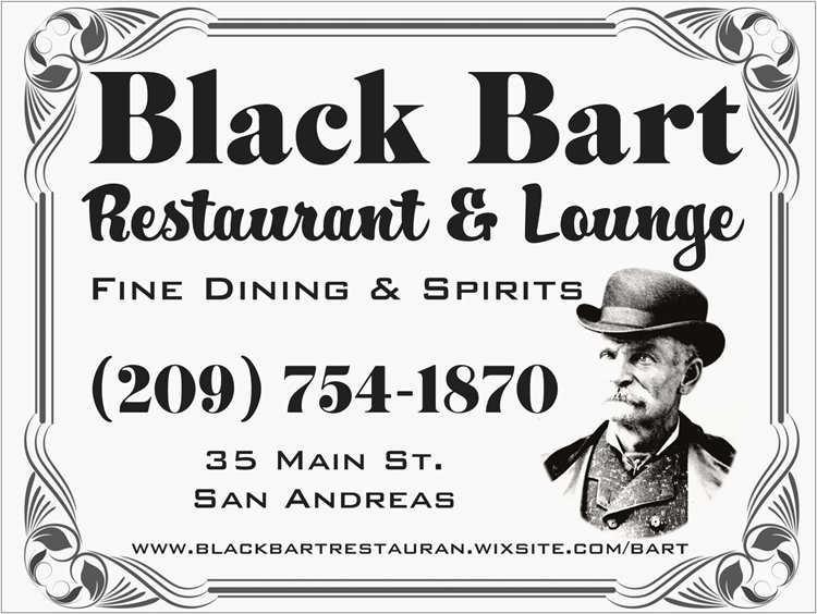 Black Bart Restaurant 35 Main St, San Andreas, CA blackbartinn.wixsite.com (209) 754-1870 The beautiful Black Bart Lounge is located in the heart of historic San Andreas, California. Serving Fresh Seafood and Steaks!