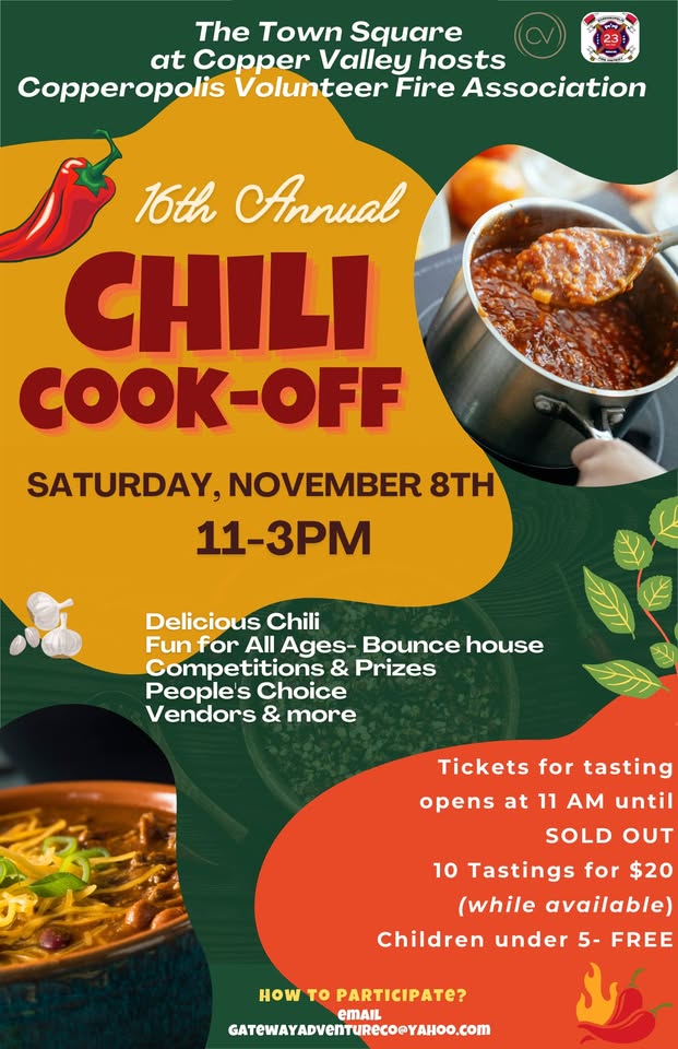 16th annual Chili Cook off, November 8th 11am-3pmFun event for the whole family.