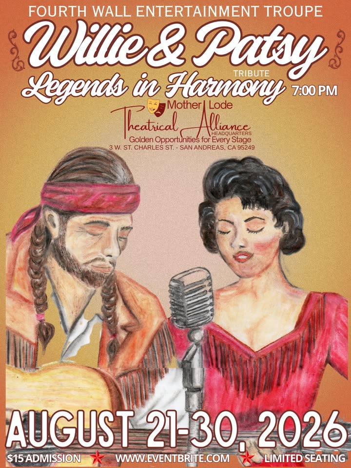 Join us for a live tribute to Willie Nelson and Patsy Cline at the newly renovated Mother Lode Theatrical Alliance Headquarters! Enjoy luxury seating while sipping a specialty cocktail.
