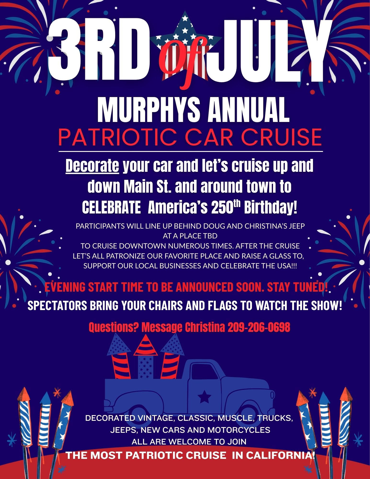 Save the Date! The 3rd of July Murphys Annual Patriotic Car Cruise returns to Murphys Friday, July 3, 2026. Celebrate America's 250th Birthday. More details to follow. For more information