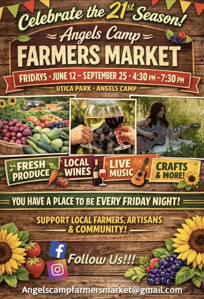 Sponsored by the Angels Camp Business Association, the market returns to our beloved Utica Park with the same vibrant atmosphere our community has come to love—featuring local farm-fresh produce, artisan craft vendors, local wines, and live entertainment.