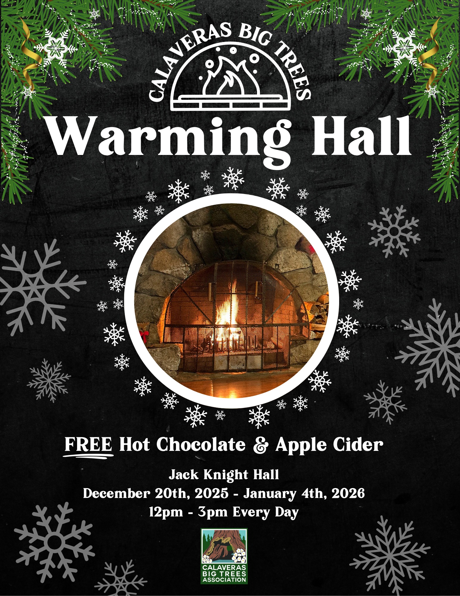 Big Trees State Park is bringing back the Warming Hall and hosting it for longer! From December 20th – January 4th, come by Jack Knight Hall from 12pm-3pm for FREE hot chocolate and cider, courtesy of the Calaveras Big Trees Association. Cozy up to our roaring (but safe!) fire and admire our historic building from the Civilian Conservation Corps era.