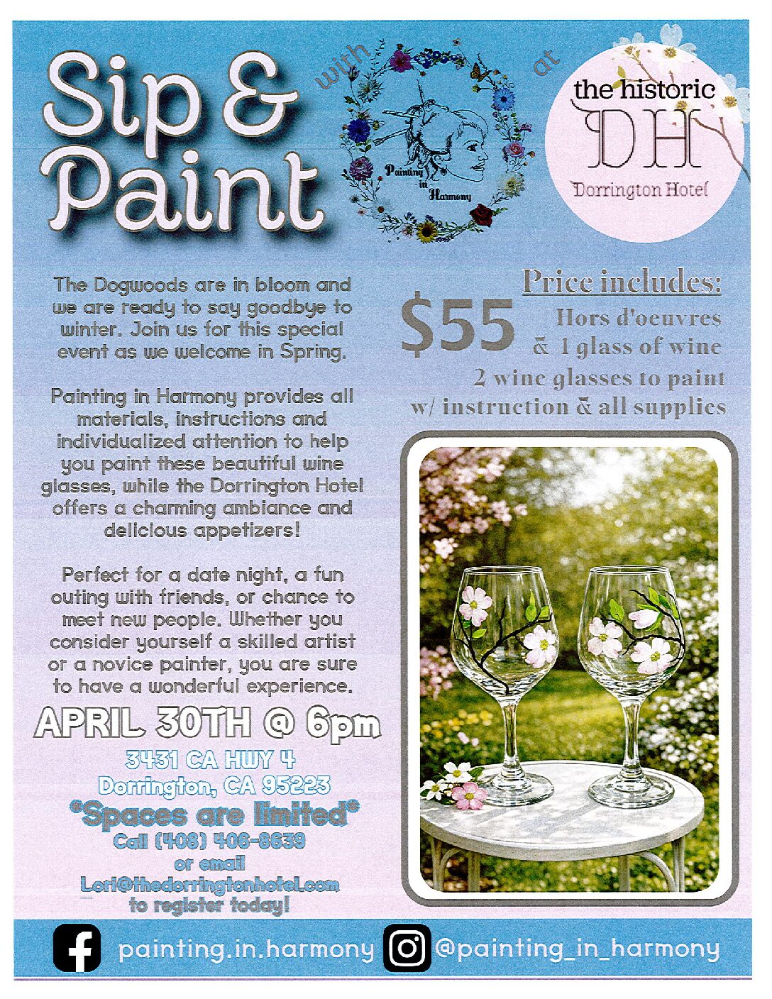 Wine & Dogwood Painting Night with an Art Teacher at the Dorrington Historic Hotel — sip, paint, and unwind Spaces are limited. To reserve your spot call 408-406-8639 or email lori@thedorringtonhotel.com