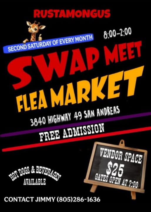 july, 2026 Rustamongus Swap Meet & Flee Market3840 Highway 49 11jul8:00 am2:00 pmSwap Meet Flea Market Event DetailsSwap, Shop & Score — Every 2nd Saturday! Event Details Swap, Shop & Score — Every 2nd Saturday! Time (Saturday) 8:00 am - 2:00 pm LocationRustamongus Swap Meet & Flee Market3840 Highway 49 Organizer Rustamongus Swap Meet & Flee Market805-286-1636 CalendarGoogleCal